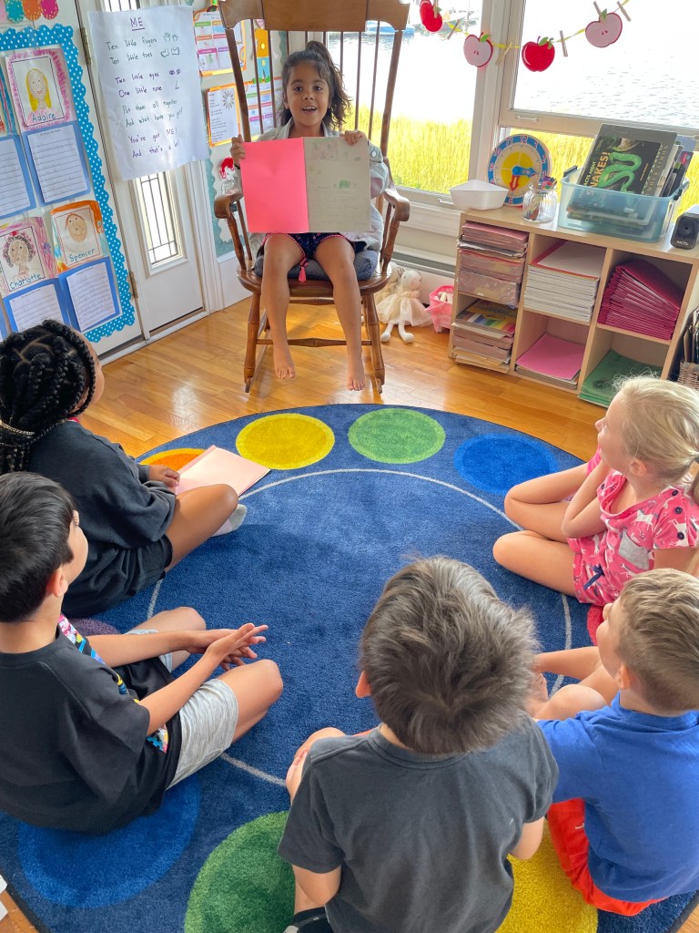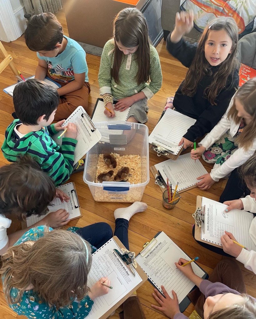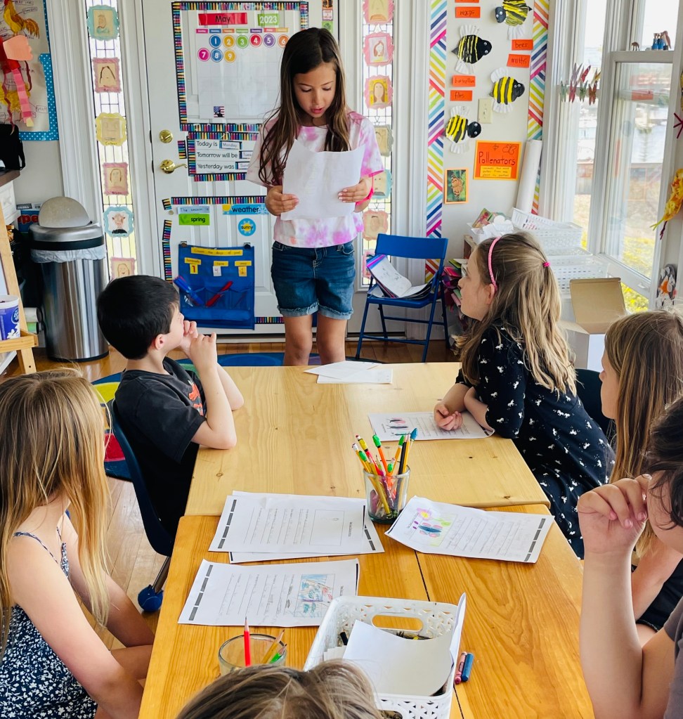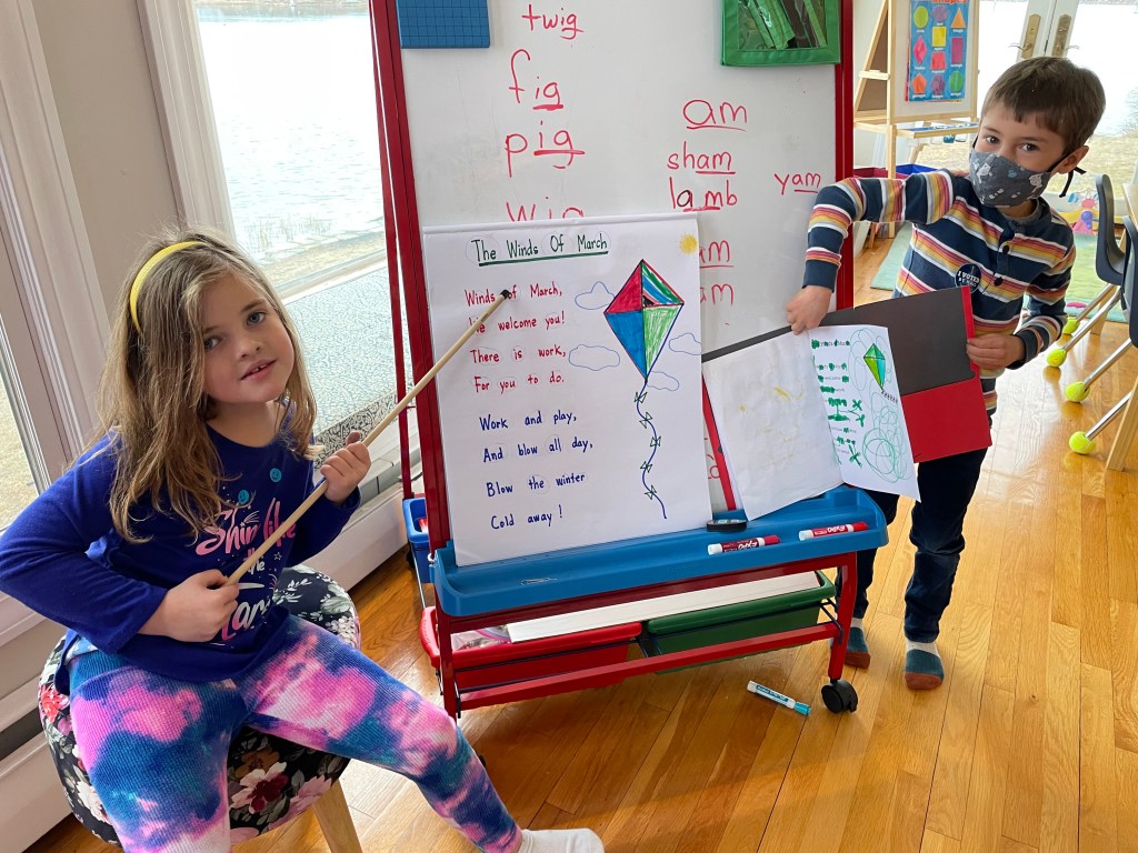 Drop off would be at 9 at our new East Providence location. We have a soft start as some families are commuting from afar. We have a morning meeting to discuss our learning goals for the day. Lessons in science, reading, writing, art and more would take place until our mid-morning snack break. This is followed by outdoor play and exploration. Then, back to more student-driven, inquiry based learning until noon. We will enjoy our packed lunch and have free play. The last hour of our day will be filled with topic lessons, poetry, physical education or art until pick-up at 2 sharp.